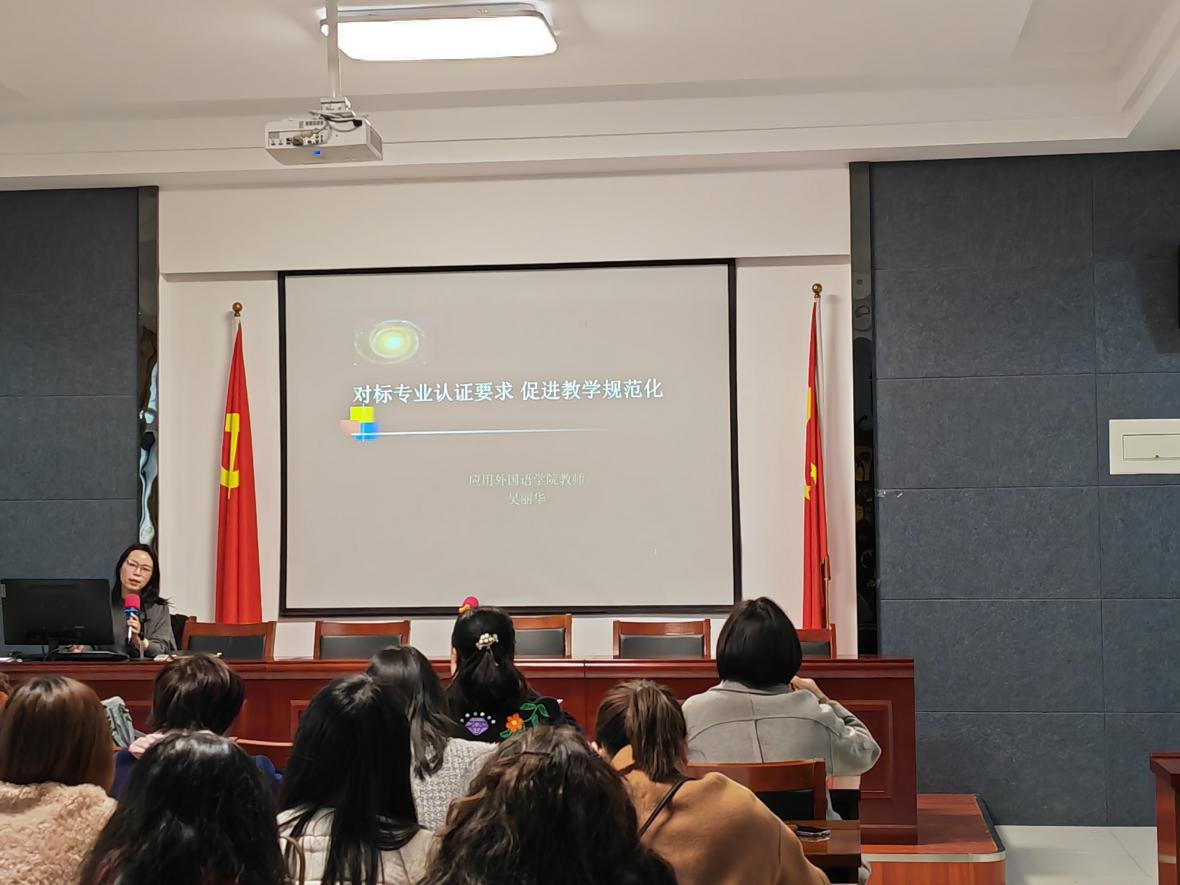 公共英语教研中心主任吴丽华进行了“对标专业认证要求,促进教学规范化”的专题培训,她首先简要介绍了二级师范专业认证的理念、“反向设计、正向施工”与课程体系及课程目标的逻辑关系,从教学大纲与人培方案、授课计划的撰写、教案规范化要素、试卷的命题、批阅与装订以及过程性考核材料的留存六个方面进行阐述和逐一梳理,指出了教师以往工作中容易忽视的问题并提出对应的解决策略。学院副院长刘文敏对学院教学要求做了强调和补充。最后,刘晓鹂对本次培训活动进行了总结讲话,提出将进一步规范教学工作、促进学院内涵建设,为今后工作开展拓宽思路、明确方向。