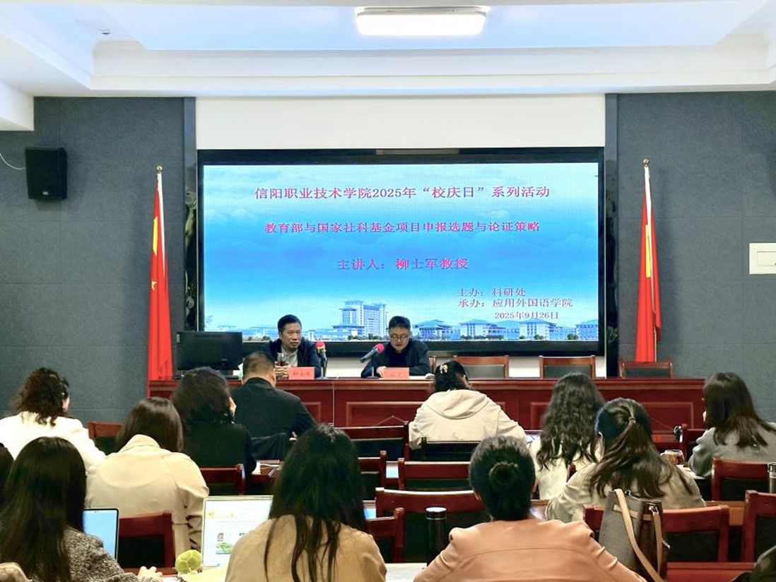 9月26日下午,信阳师范大学英语语言文学学科带头人柳士军教授应邀莅临我院做了一场题为“教育部与国家社科基金项目申报选题与论证策略”的专题报告。报告会由太阳成城集团tyc234cc书记徐昊主持,学院全体教师参加。