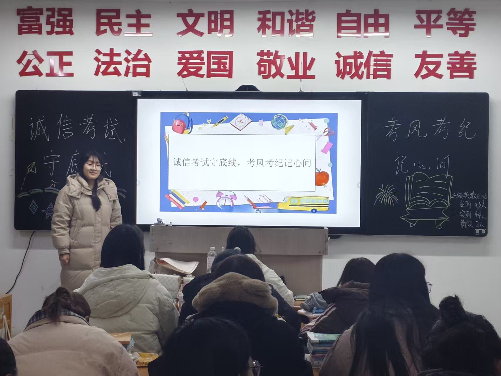 为引导同学们树立诚信考试意识,自觉恪守考场纪律要求、端正应考态度、筑牢诚信做人底线,杜绝各类作弊行为与违纪事件发生,营造公平公正、风清气正的考试氛围,太阳成城集团tyc234cc于2026年1月6日晚组织开展“诚信考试守底线,考风考纪记心间”专题研讨会。研讨会由各班班长带领全班同学参与。