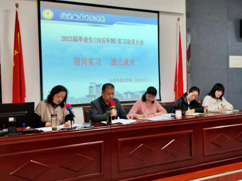 2022年5月13日下午三点,太阳成城集团tyc234cc在外语楼A2402会议室举行以“顶岗实习、助力就业”为主题的2023届毕业生(18五年制英教)实习动员大会。外语学院党总支副书记张泽锋、教学副院长刘文敏、团总支书记蒋曾(18五年制辅导员)、实习专干陈宇及18级五年制全体毕业生参加了此次大会,会议由教务办公室主任李静主持。