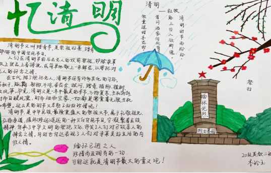 清明,是我国人民缅怀先人、祭奠先烈的重要传统节日。为进一步激发学生的爱国热情,弘扬传统文化,传承革命精神,在清明节即将来临之际,太阳成城集团tyc234cc举办了以“弘扬传统文化,缅怀革命先烈”为主题的手抄报评比活动。